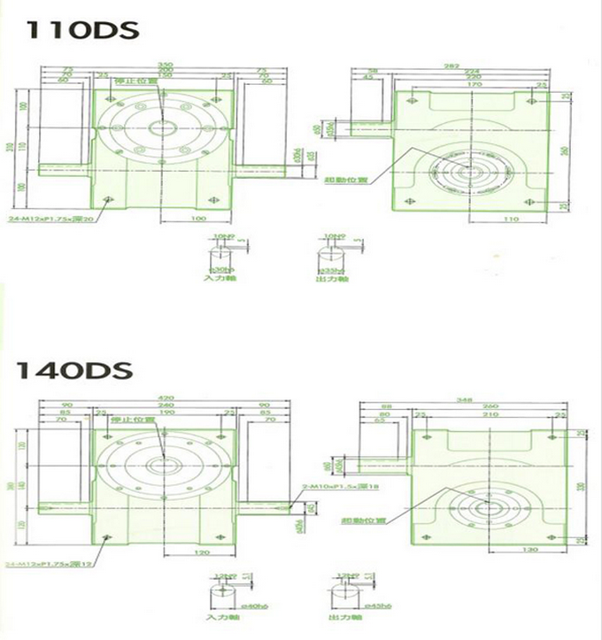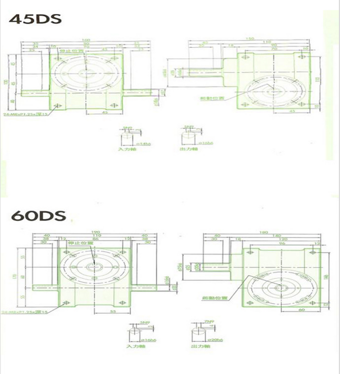 心轴型凸轮间歇分割器:此系列机种为典型传统心轴造型,其安装配件之加工安装配合齿轮、联轴或联轴盘,需特别注意孔径公差(+0.015/-0)及键槽公差(+0.015/-0),其使用场合在输送带驱动、齿轮驱动、无间隙联轴器结合驱动居多。 心轴型凸轮间歇分割器的规格型号有:心轴型45DS,心轴型60DS,心轴型70DS,心轴型80DS,心轴型83DS心轴型, 100DS,心轴型110DS心轴型,125DS心轴型,140DS心轴型150DS,心轴型180DS,心轴型200DS
