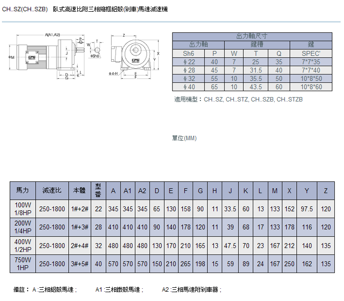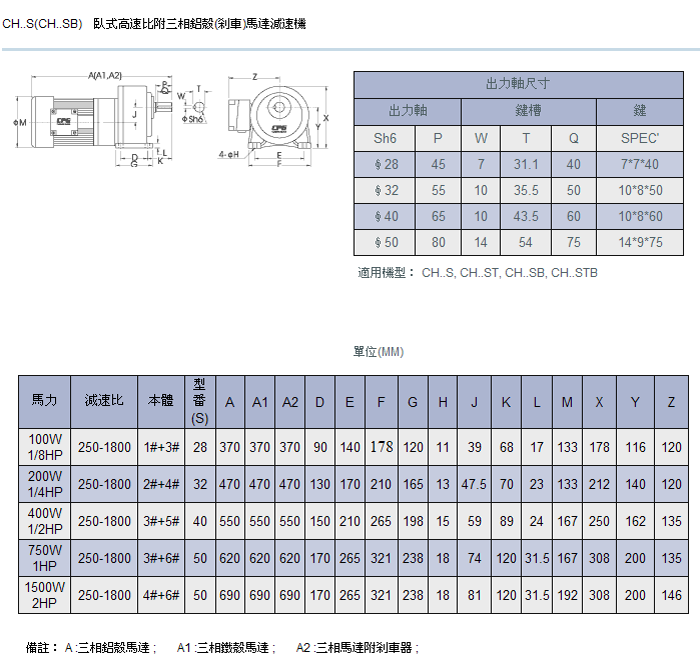 城邦卧式标准/缩框高速比马达减速机是采用日本三菱的技术设计制造。具有低噪声,低振动,体积小,重量轻,型号多样,安装维护简单等特点。特性:铝合金外壳,斜齿轮精密研磨,独特防水防潮设计、电机 IP55 保护等级、 F 级绝缘、低噪音、长寿命,免维护、现货供应、服务一流模型代号 TYPES : CH, CV, CHM, CVM, CHD, CVD 马力 CAPACITY : 100W-3700W减速比RATIO : 3, 5, 10, …1800