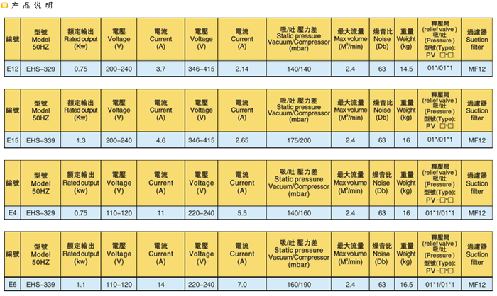 单段鼓风机EHS329/339工作原理离心式风机重量14.5 高压风机 :采用德国先进技术,在通过加上一体式的销音设施,改进了高压风机静音现像,而提升了静音的效果2、可靠性高当使用情况变化时,机器仍可安全运转。除了叶轮之外,高压鼓风机没有其他动作,因此可靠性之高几乎免维修。使用独一无二且散热良好的精密外侧轴承,因此它具有下列优点:高压缩比;轴承运转温度低;润滑油脂寿命长;免保养。 3.安装容易 配备齐全,可随时安装与使用,供压缩空气或用于抽真空,也可任意安装于水平或垂直的方向。 4.无油无污染 叶轮旋转时,不与任何部分零件接触,免润滑,因此可保证百分之百无污染。 5.最高品质 经过17年的专业制造经验,最精密机械设计加上慎重电机配合标准仪器测试,使用所有零件均能达到最高品质要求,运用标准ip54,f级马达效率高,故障极少,马达与鼓风机之间有轴封分试,预防异物进入。同时为确保功能效果,每一台鼓风机在出厂前均经过严格测试。 6.电压:万国电压型,50HZ 60HZ均可用,无论您的产品是出口至欧美的使用60Hz,高电压的国家,还是中东,非洲等使用50Hz电压的国家及地区,本风机均能达到要求,功能产齐全,让您无后顾之忧! 适应行业:剑杆织机、丝网印刷机、成像机、照排机、切纸,医疗设备,食品机械,各式燃烧机,锅炉设备,环保设备,木工机械、除尘设备,pcb设备,除湿干燥机清洗设备,,吸尘设备,公共场所供氧,干洗设备,等等。